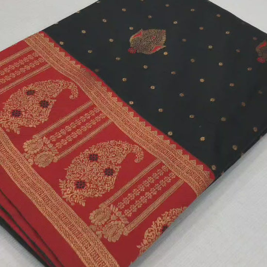 FABRIC :- Pure Soft Banarasi Silk Saree With Beautiful Colours And Contrast Weaving Border And Pallu With All Over Beautiful Zari Weaving Design And Rich Weaved Pallu And Blouse