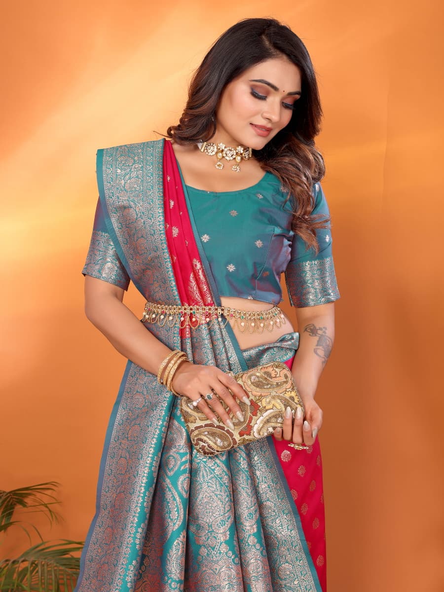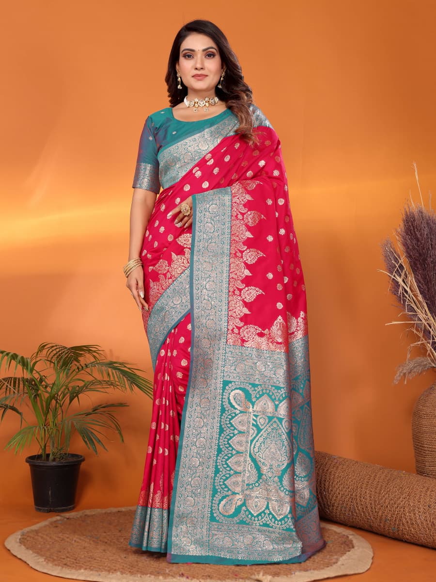 Fabric :- Pure Soft Banarasi Silk Saree With Beautiful Colours And Contrast Weaving Border And Pallu With All Over Beautiful Zari Weaving Design And Rich Weaved Pallu And Blouse