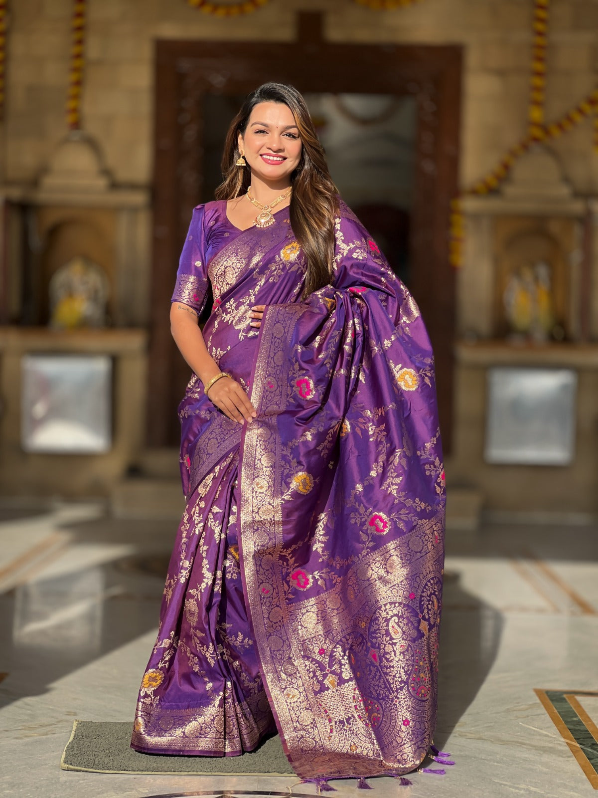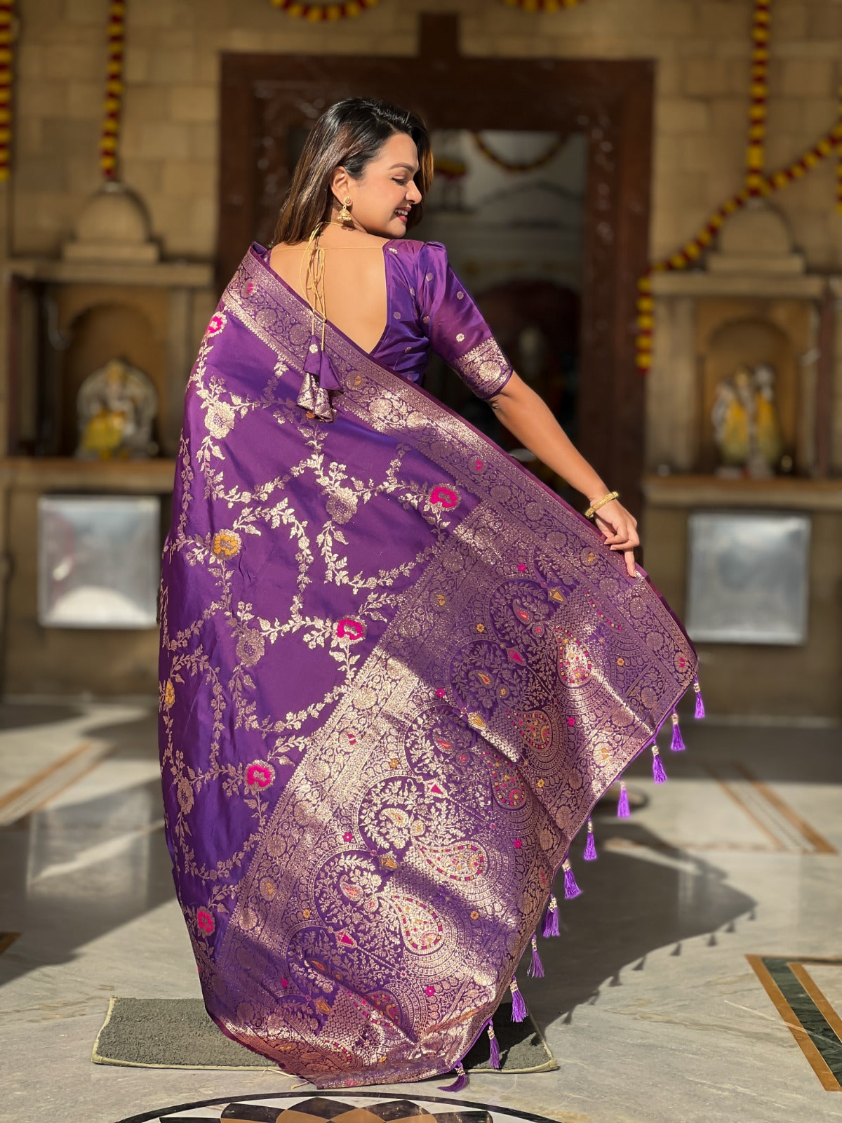 Saree :- Soft Banarasi silk saree with zari weaving Meenakari touchup design all over the saree & Meenakari weawing Rich pallu with Meenakari weawing border & Tassels attached at Pallu End.