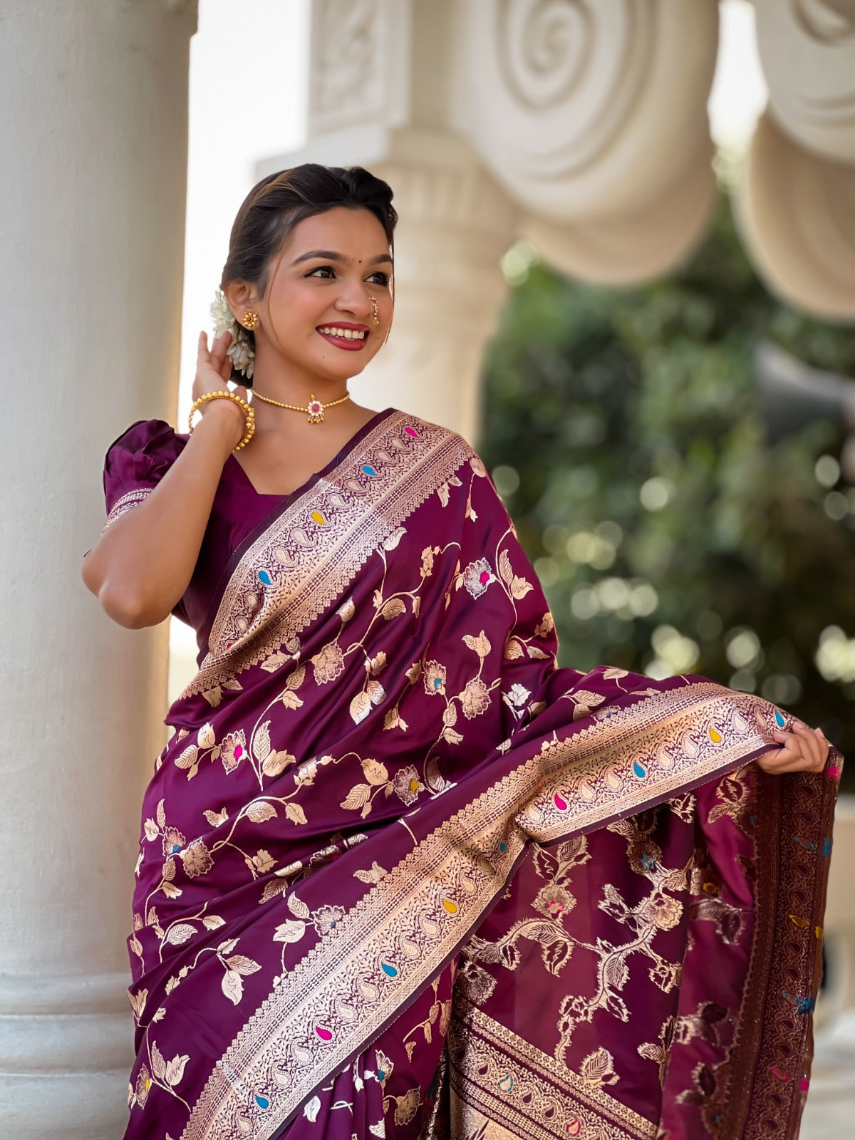 Saree :- Soft Banarasi silk saree with zari weaving Meenakari touchup design all over the saree & Meenakari weawing Rich pallu with Meenakari weawing border & Tassels attached at Pallu End.