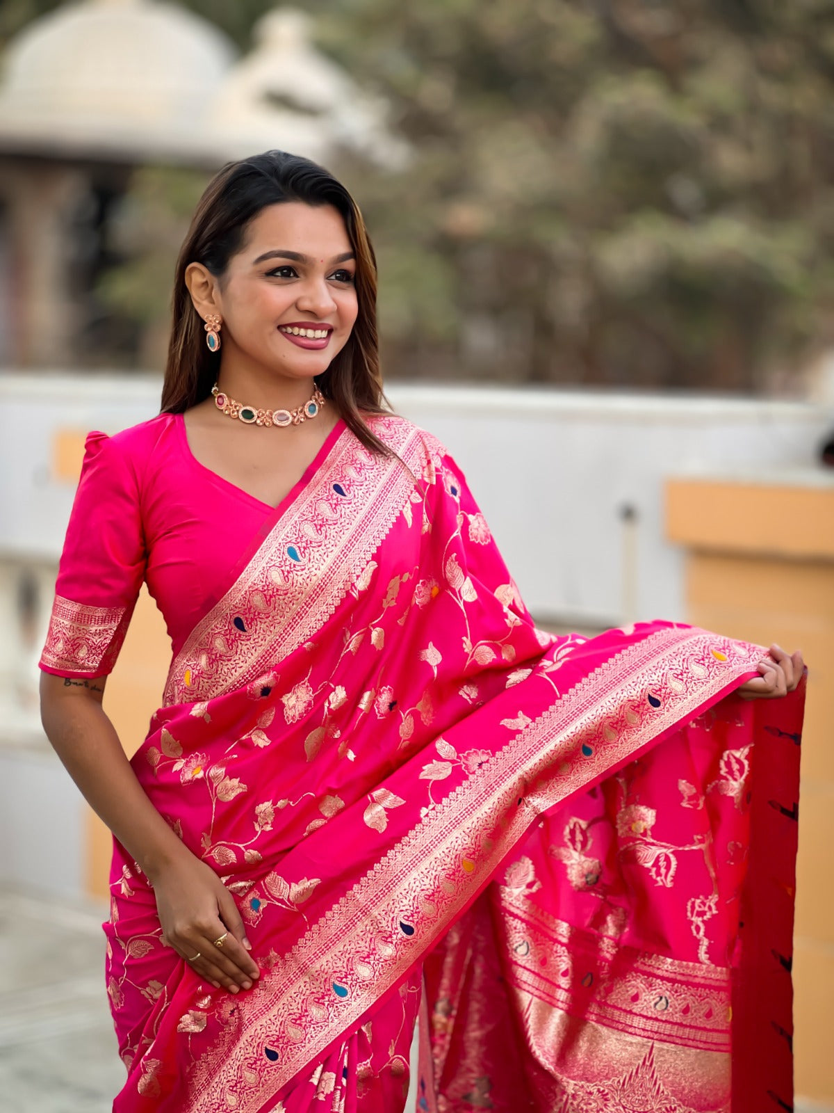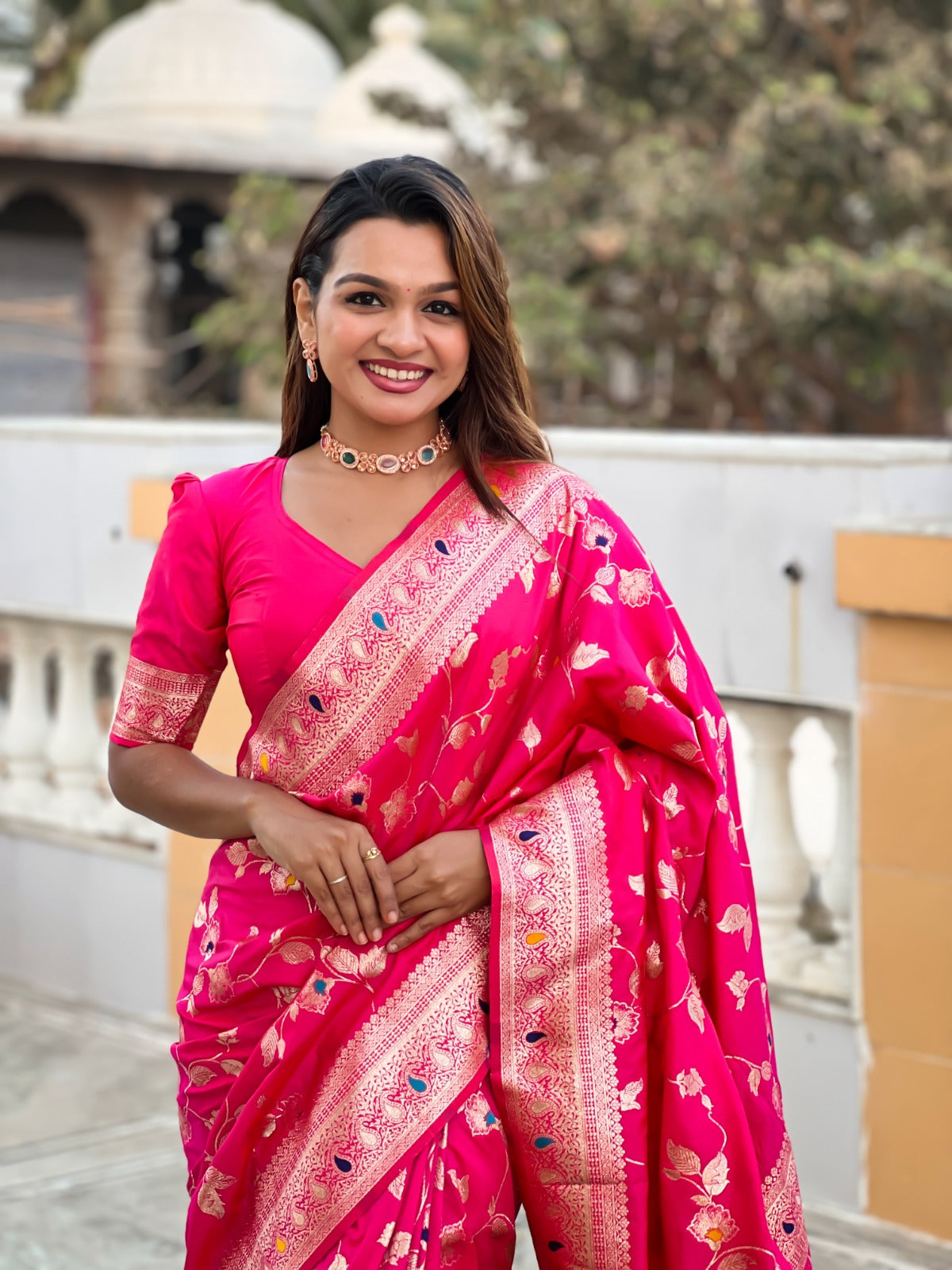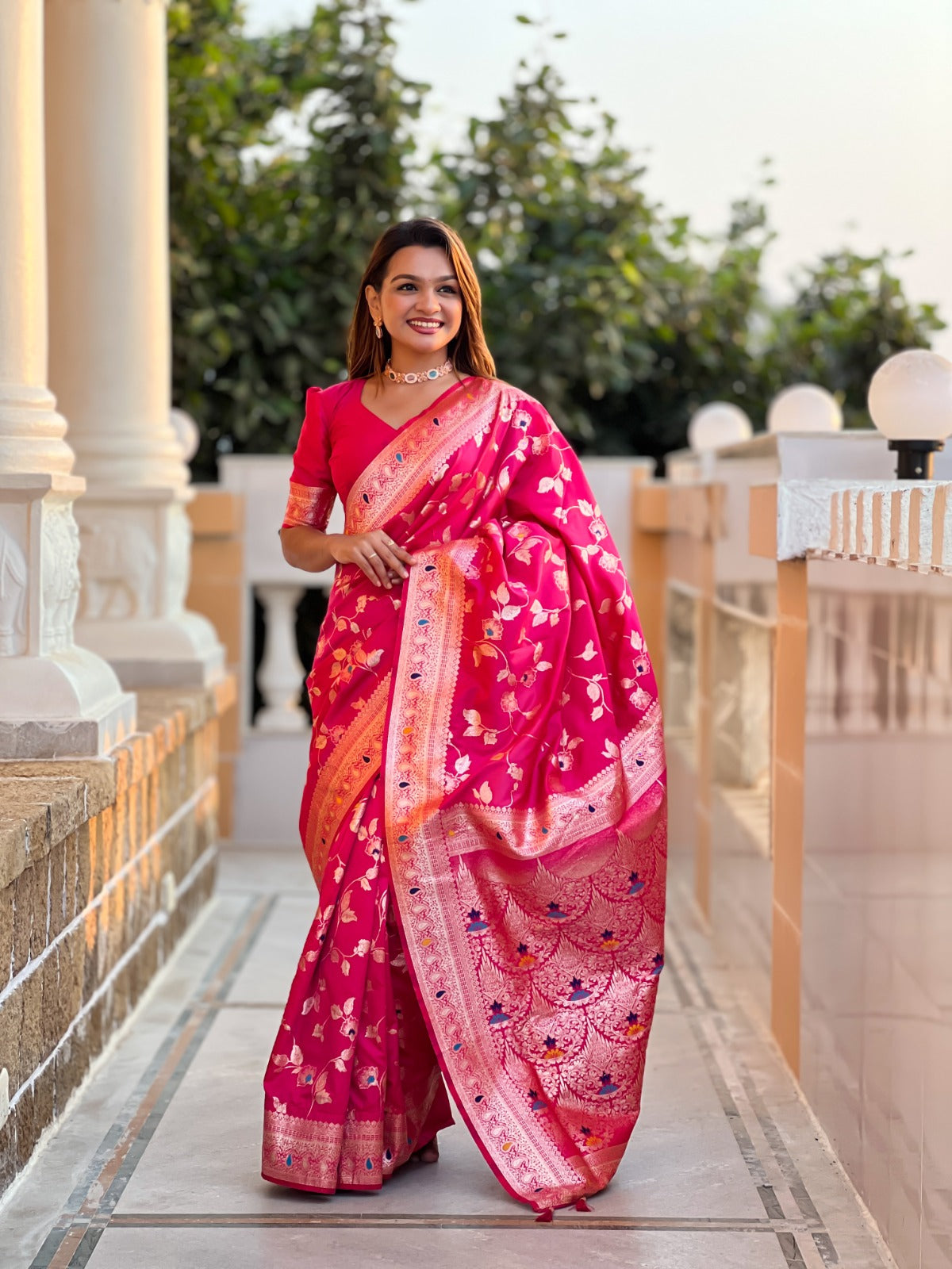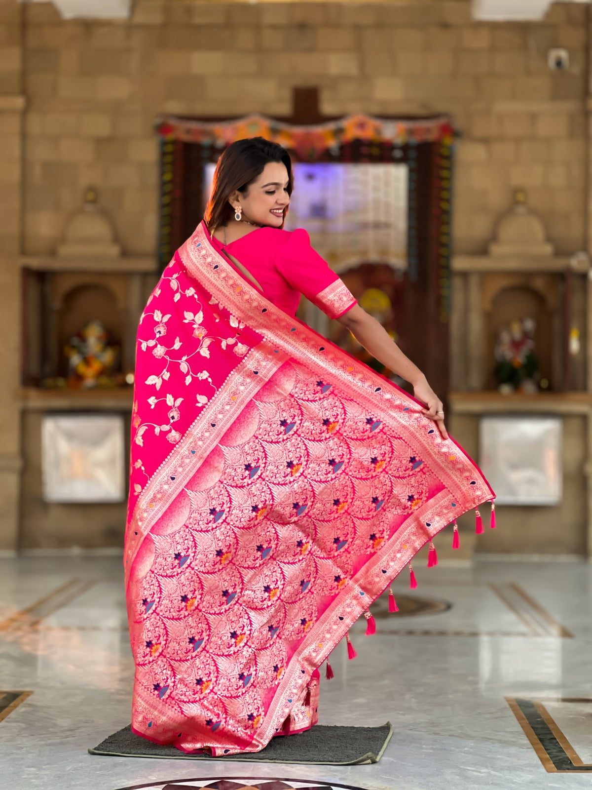 Saree :- Soft Banarasi silk saree with zari weaving Meenakari touchup design all over the saree & Meenakari weawing Rich pallu with Meenakari  weawing border & Tassels attached at Pallu End.