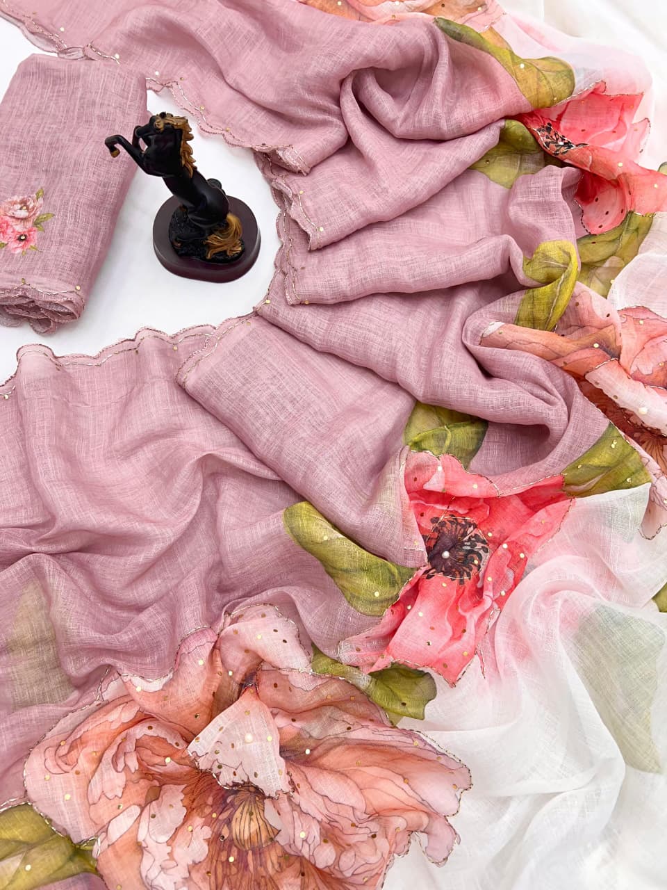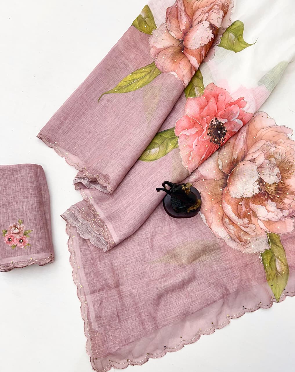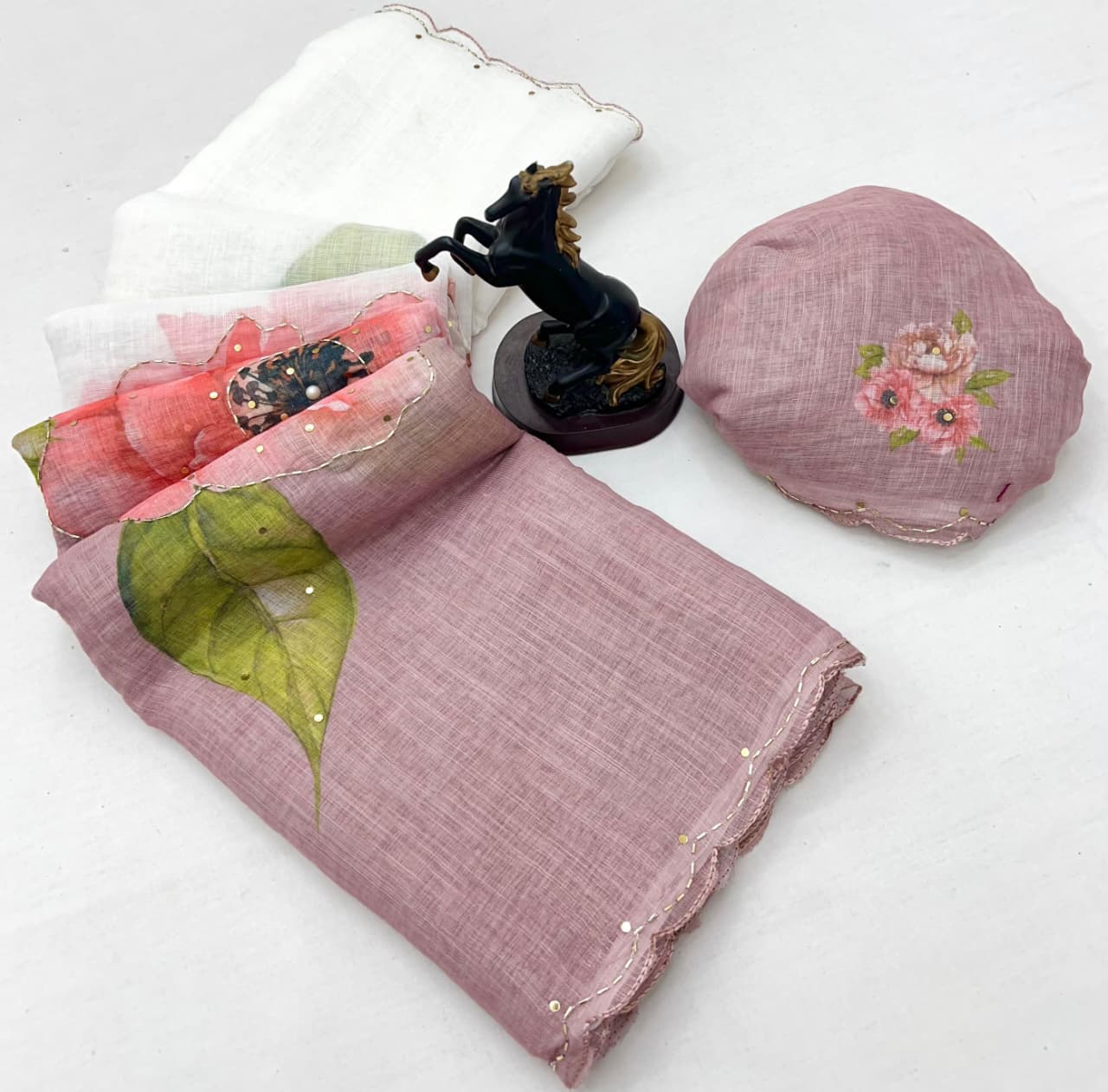 This elegant saree is crafted from pure linen, making it soft, breathable, and lightweight. 🌸
